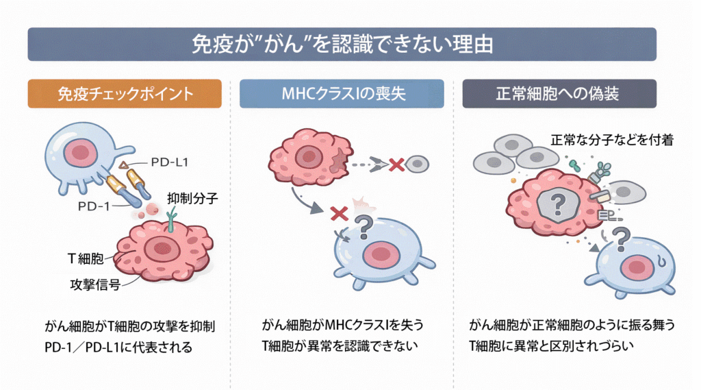 この場合、 免疫細胞はがん細胞を識別する手がかりを得られず、 認識が成立しにくくなります。